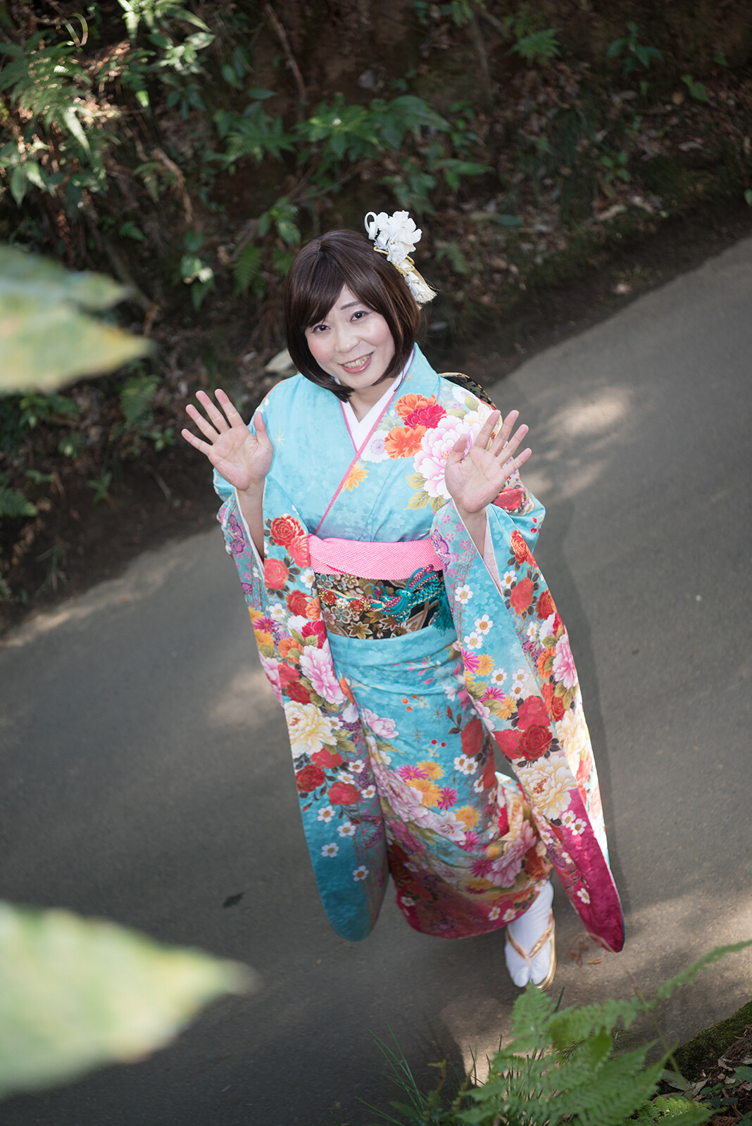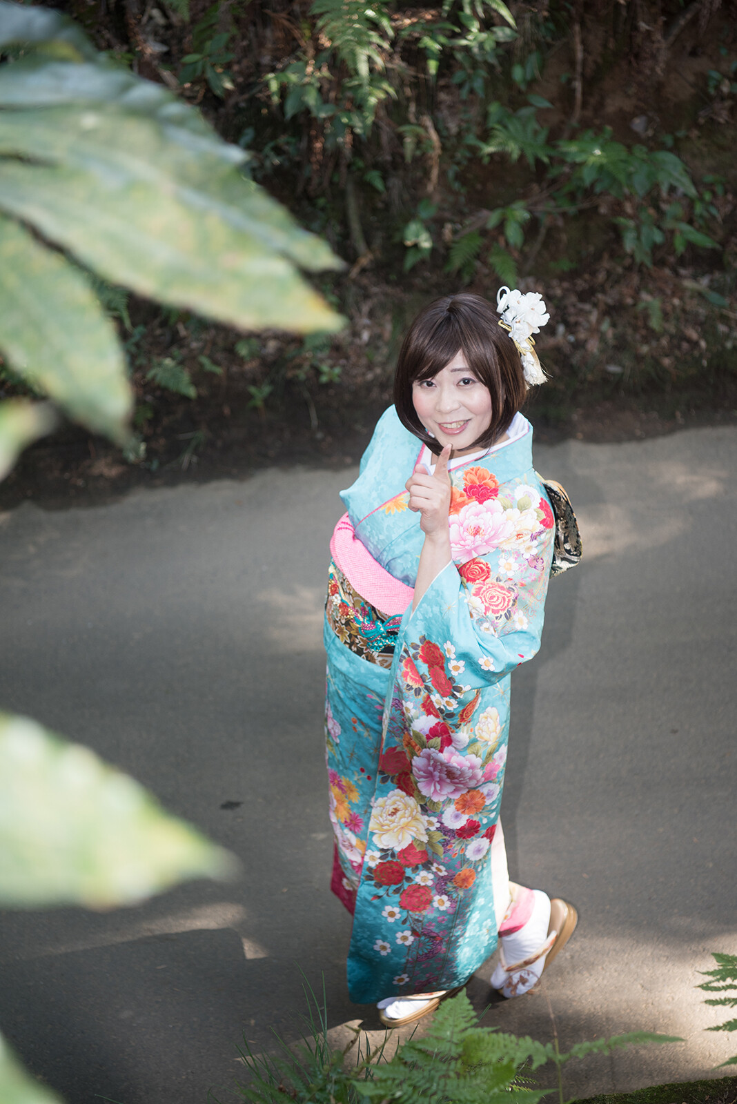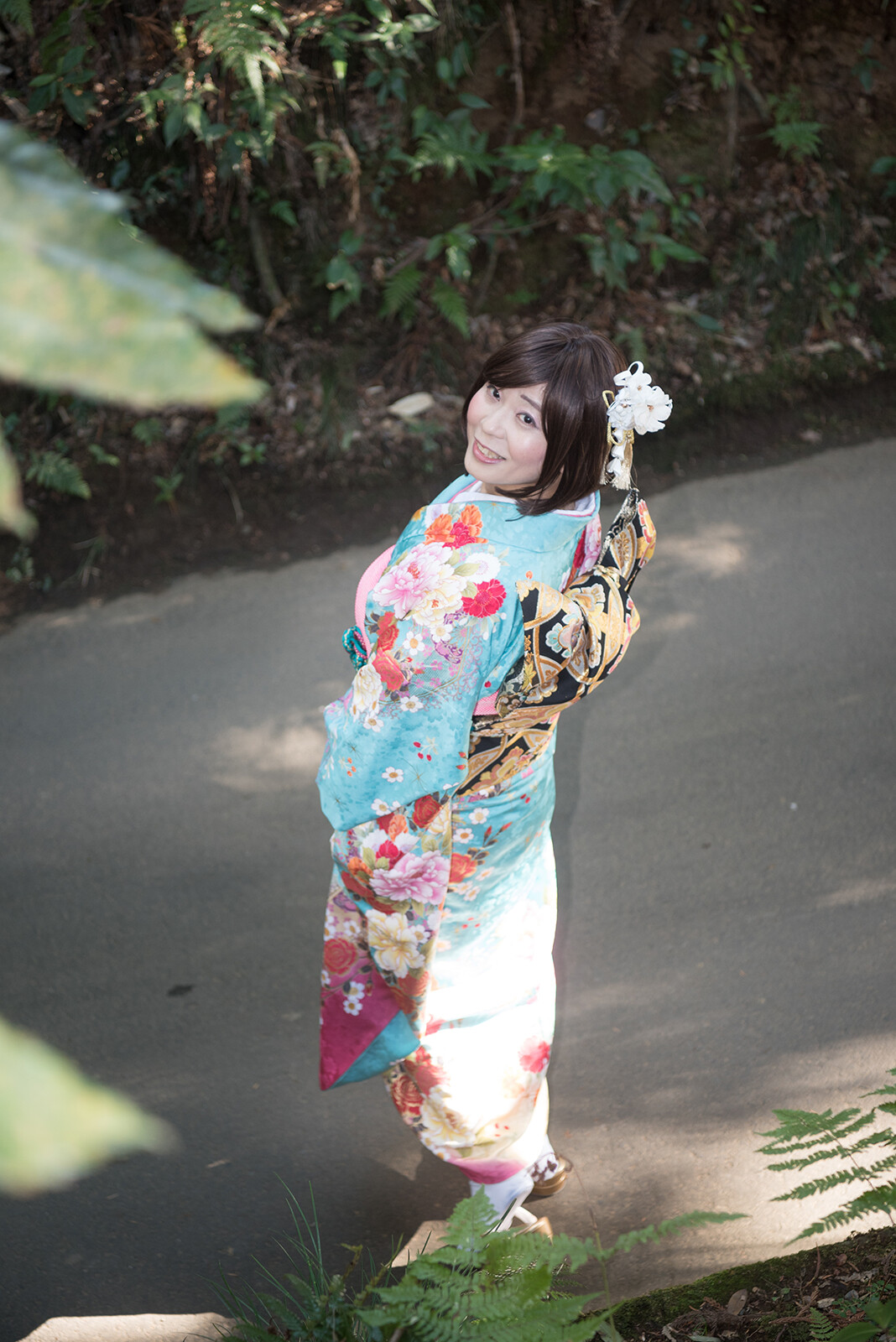 後ろ姿を撮った後は振り向きポーズ