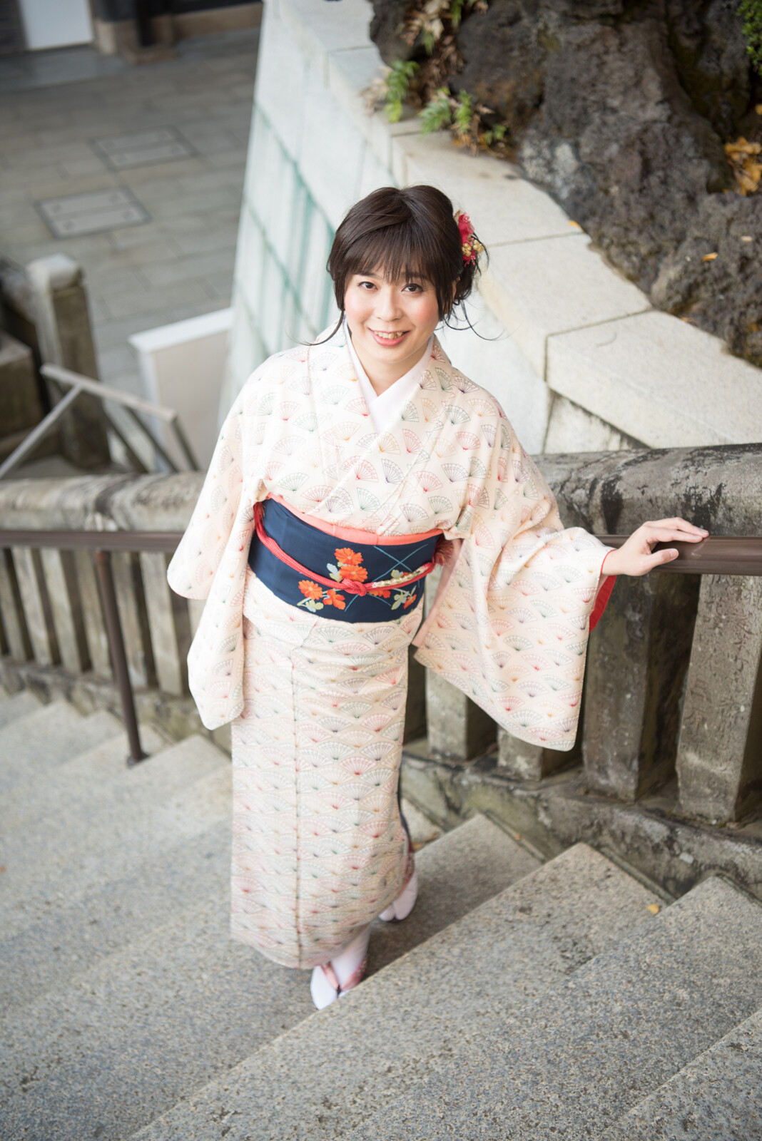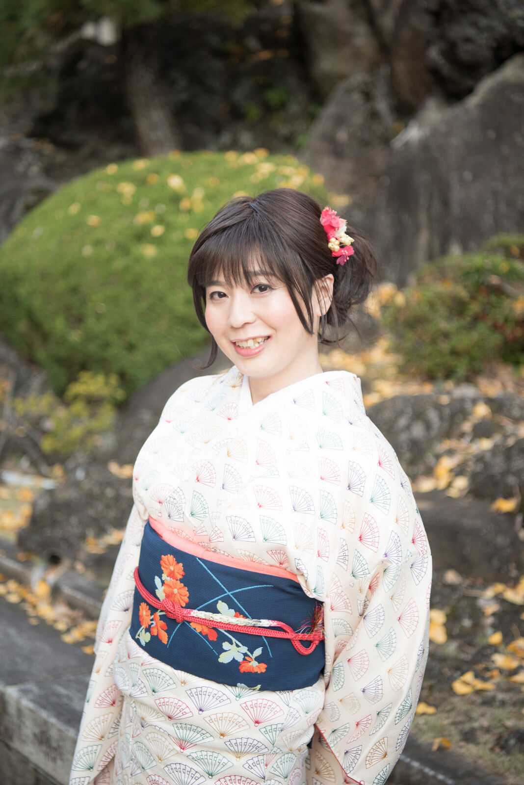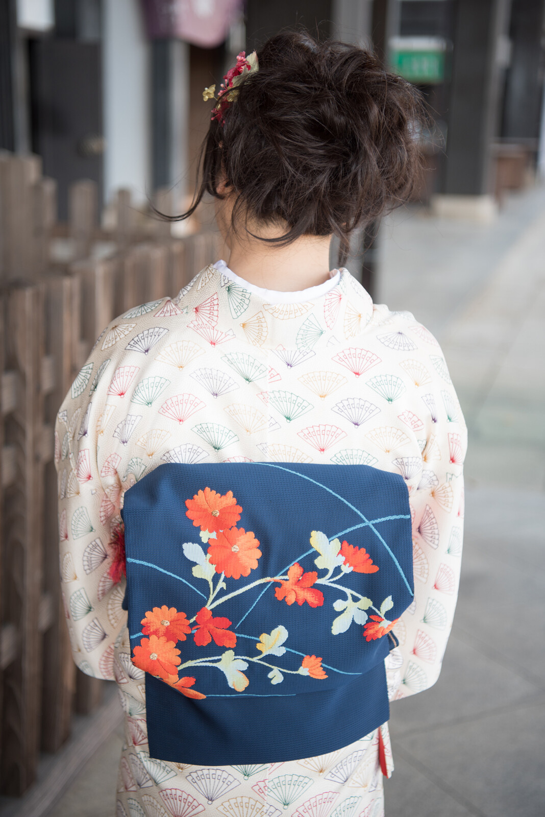 前回掲載したオレンジ色の着物(訪問着)の他、今回の扇柄の着物(小紋)をお母さんからもらいました