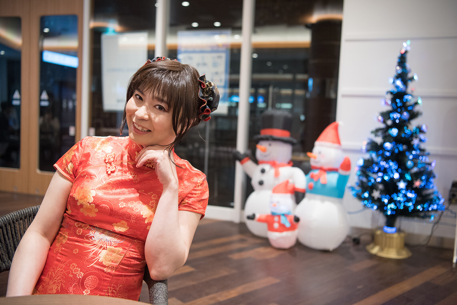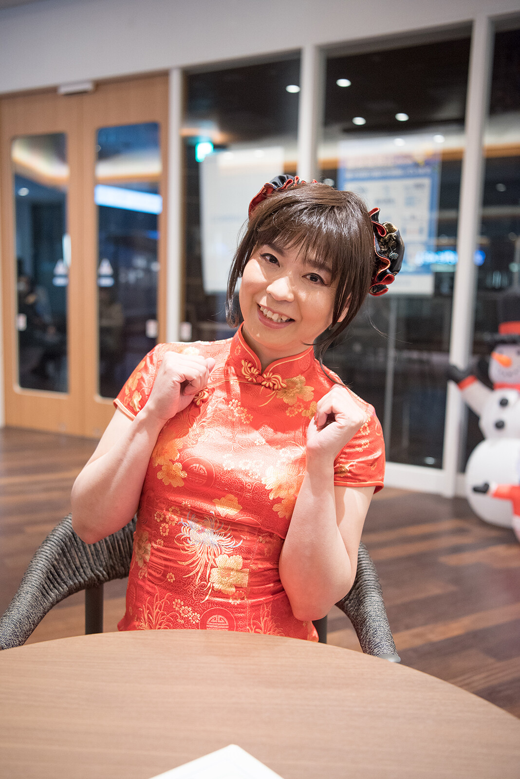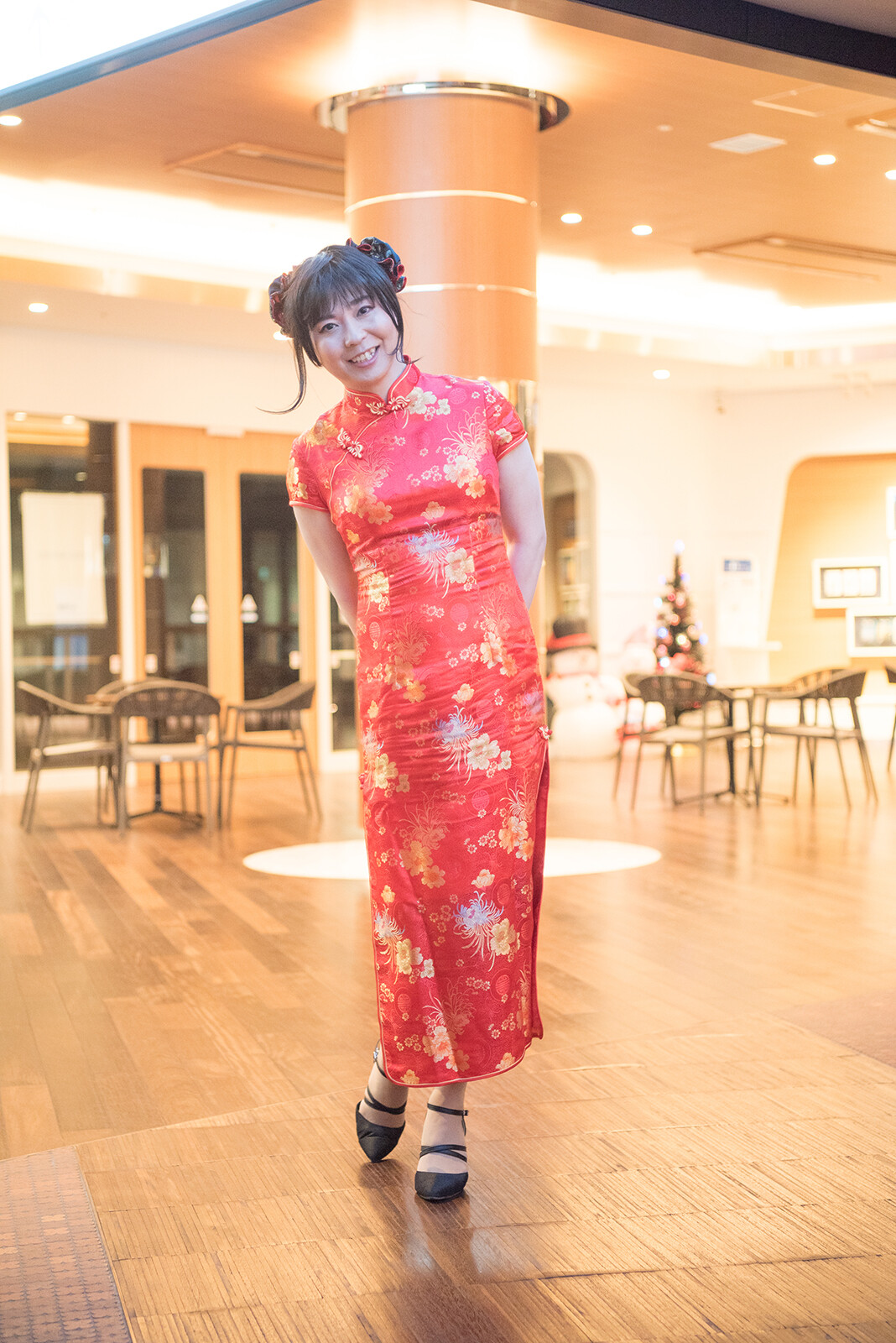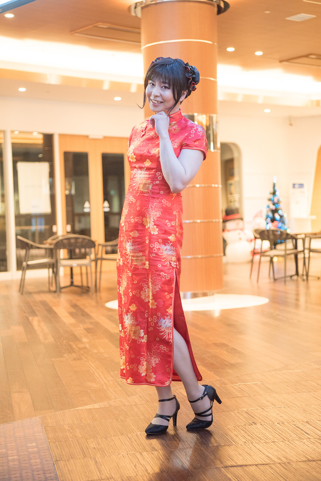 照明の明かりがチャイナドレスを照らして輝いていますね。