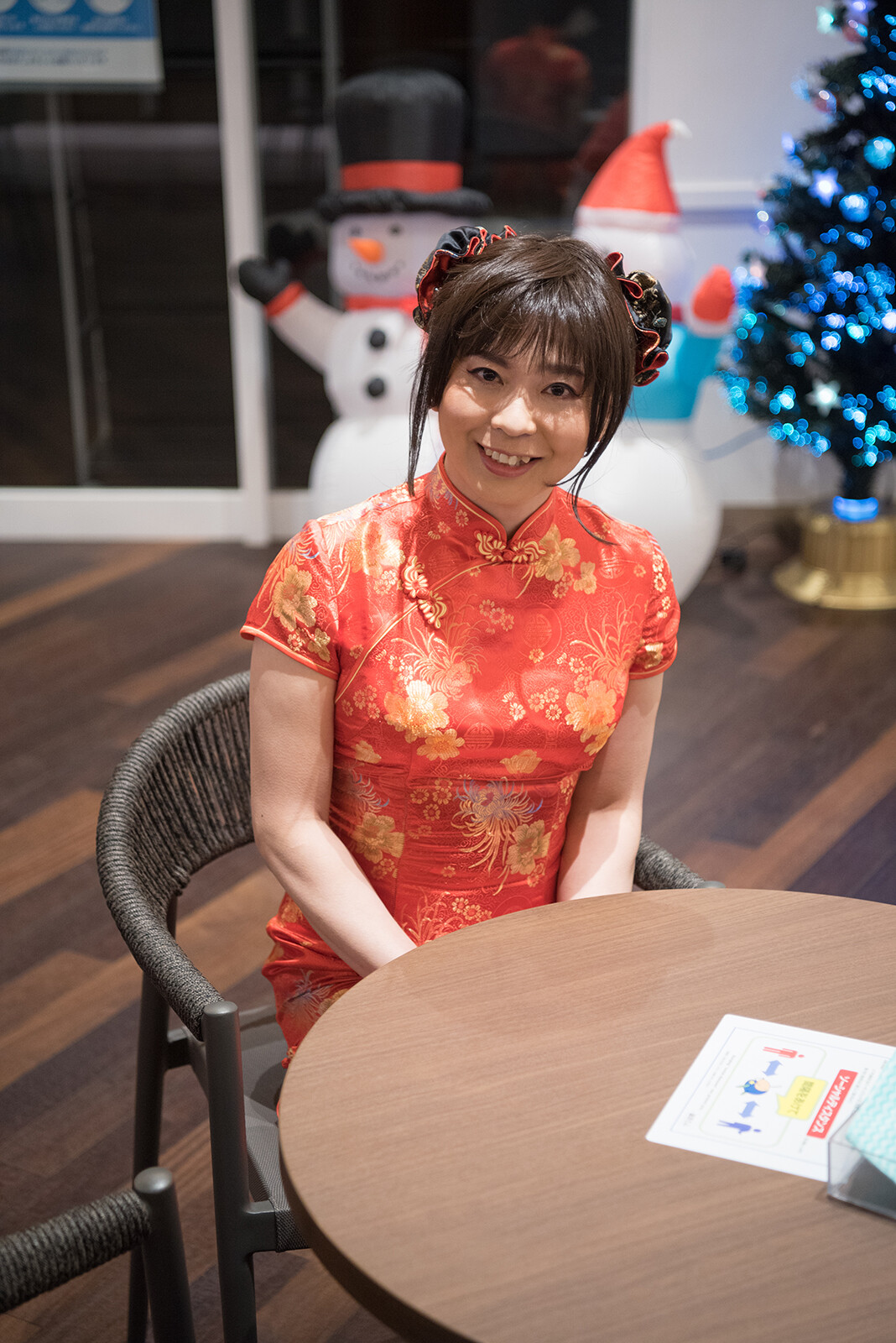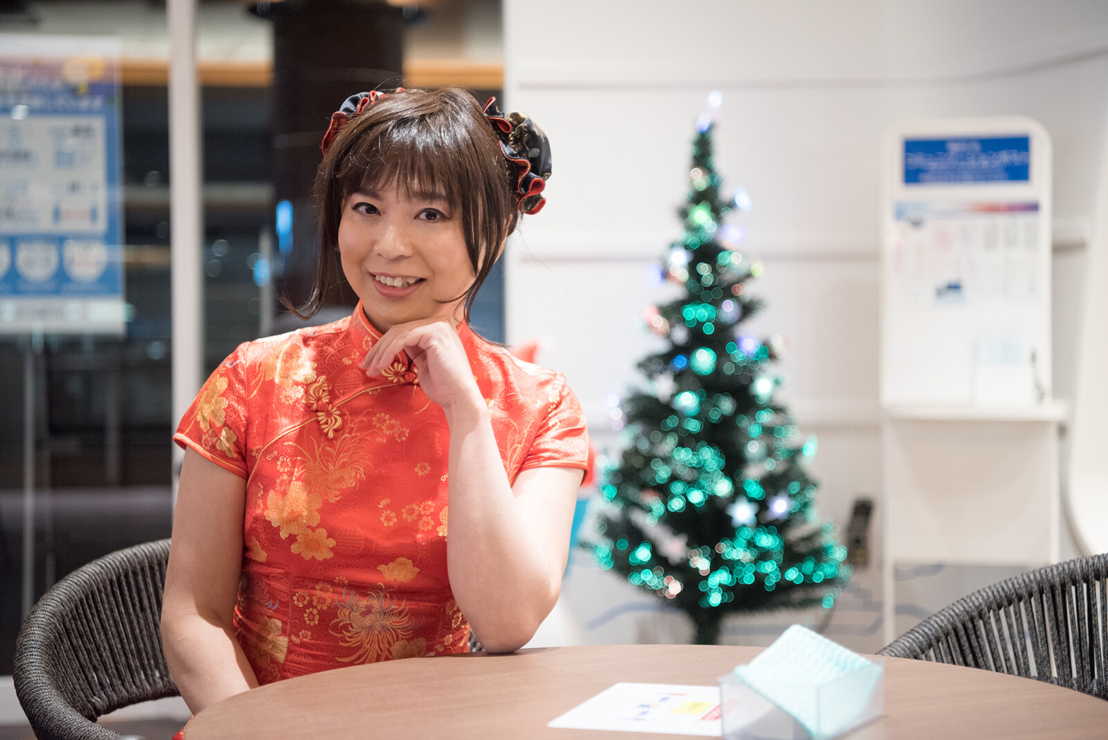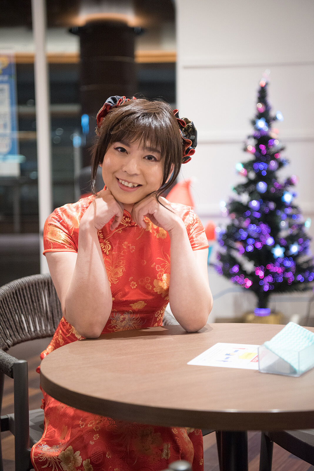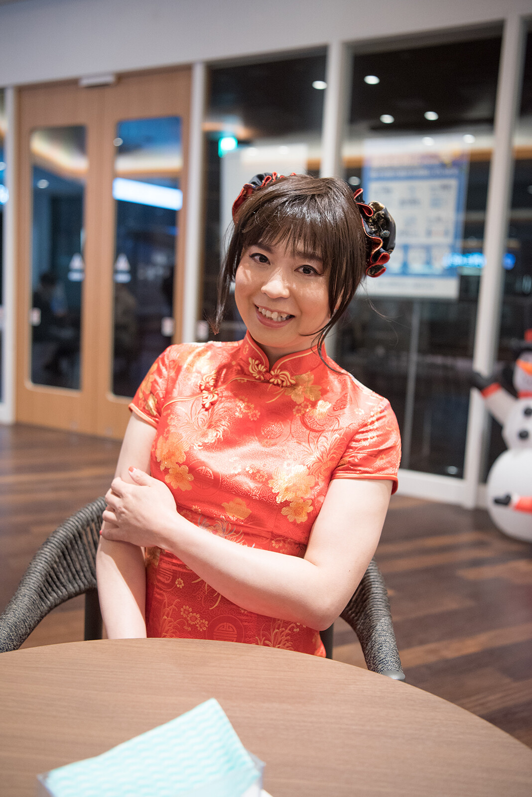 照明の明かりがチャイナドレスを照らして輝いていますね。