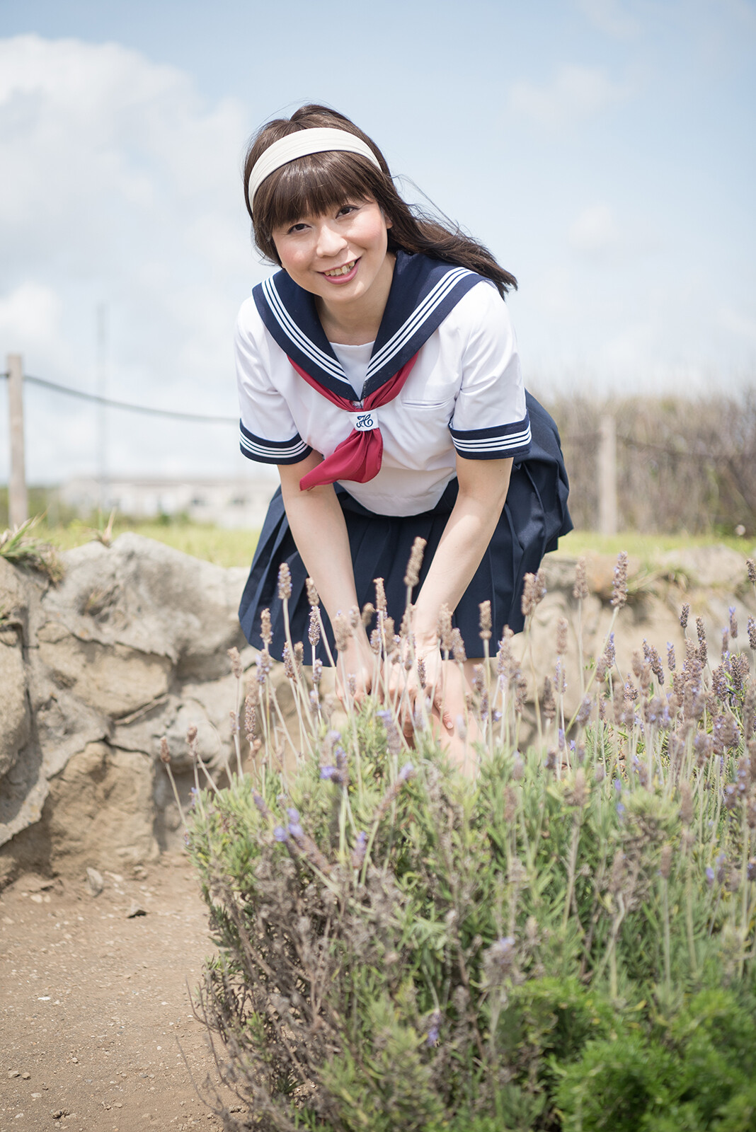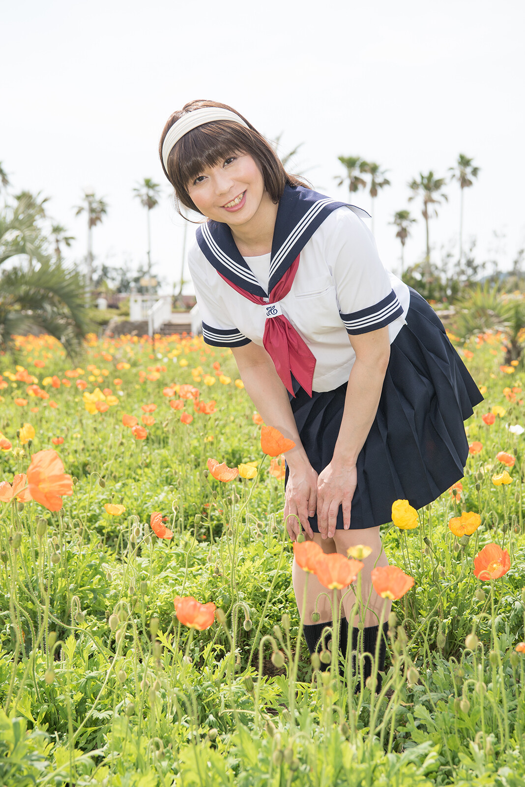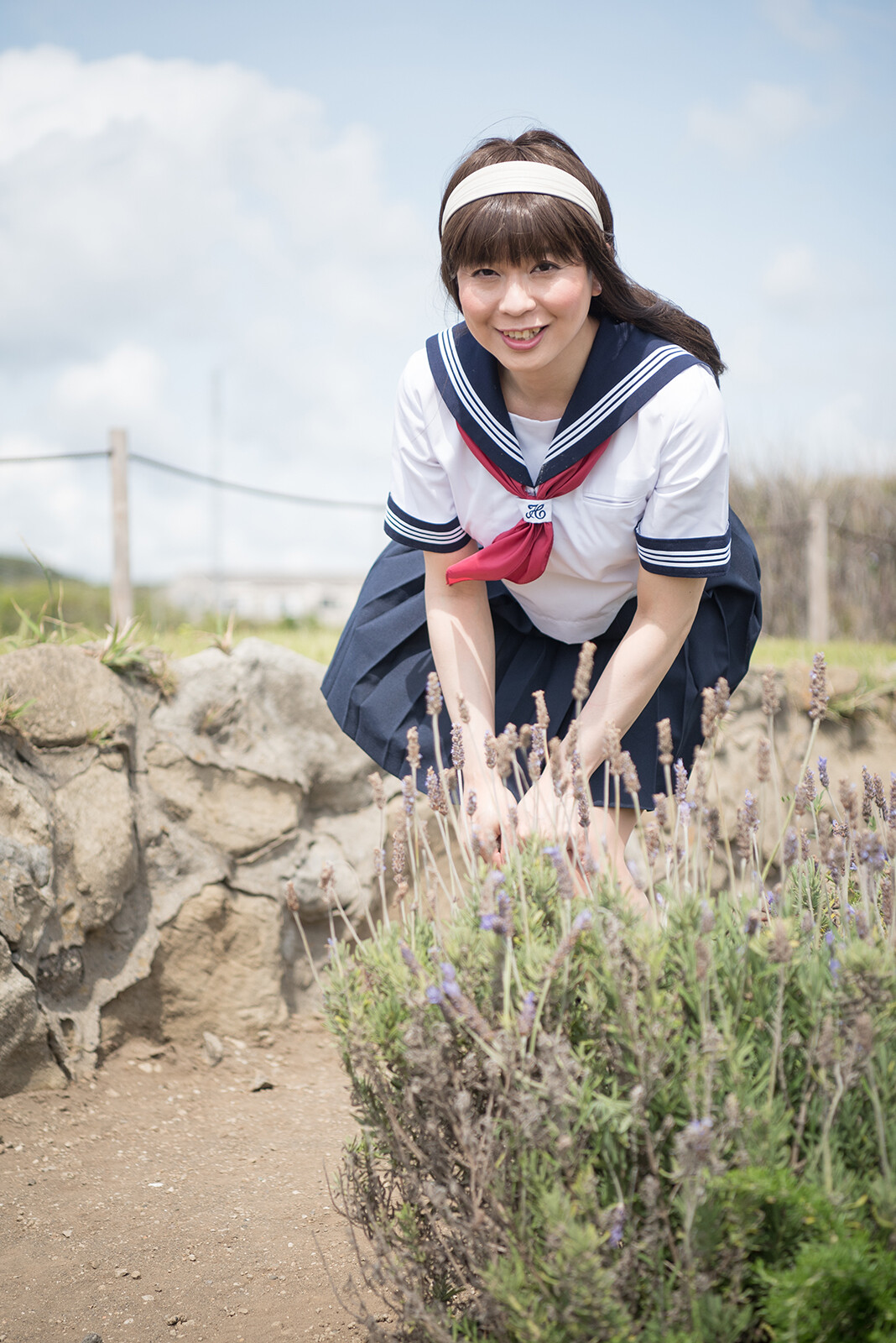 前屈みでポーズを取っている時に、後ろから強い風が吹いてきましたよ。