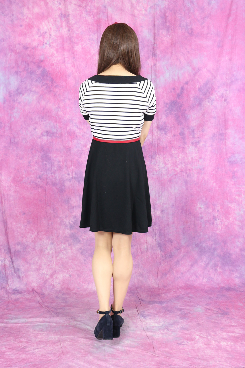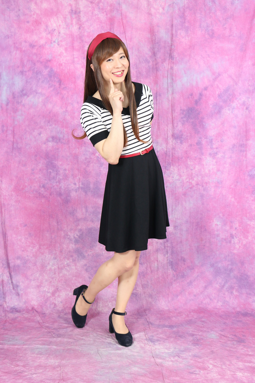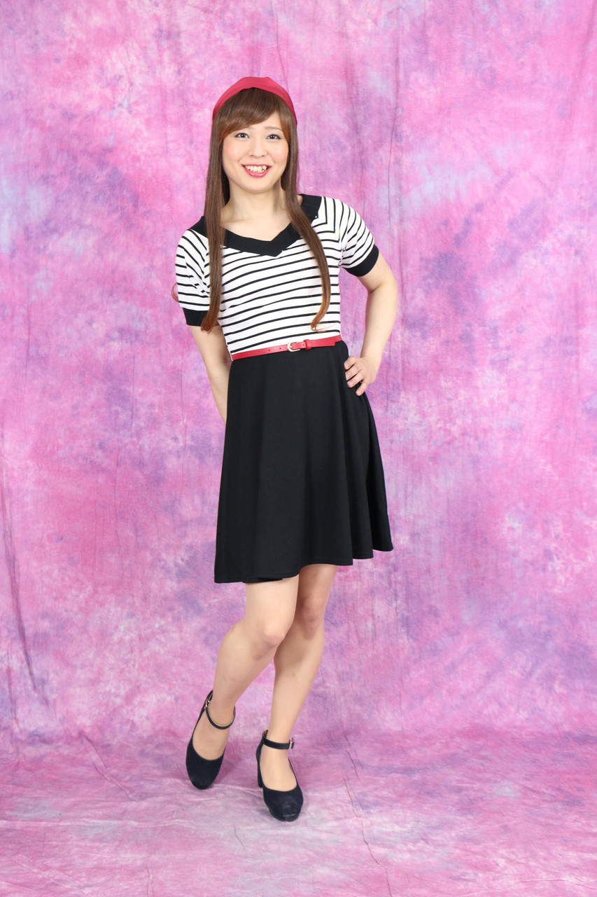 白と黒のワンピースなので、カチューシャとベルトを赤にして、アクセントを加えてみました