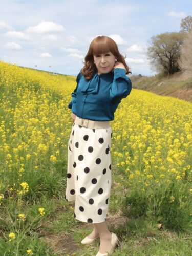 紺のリボンブラウス大きなドット柄のスカート(1)