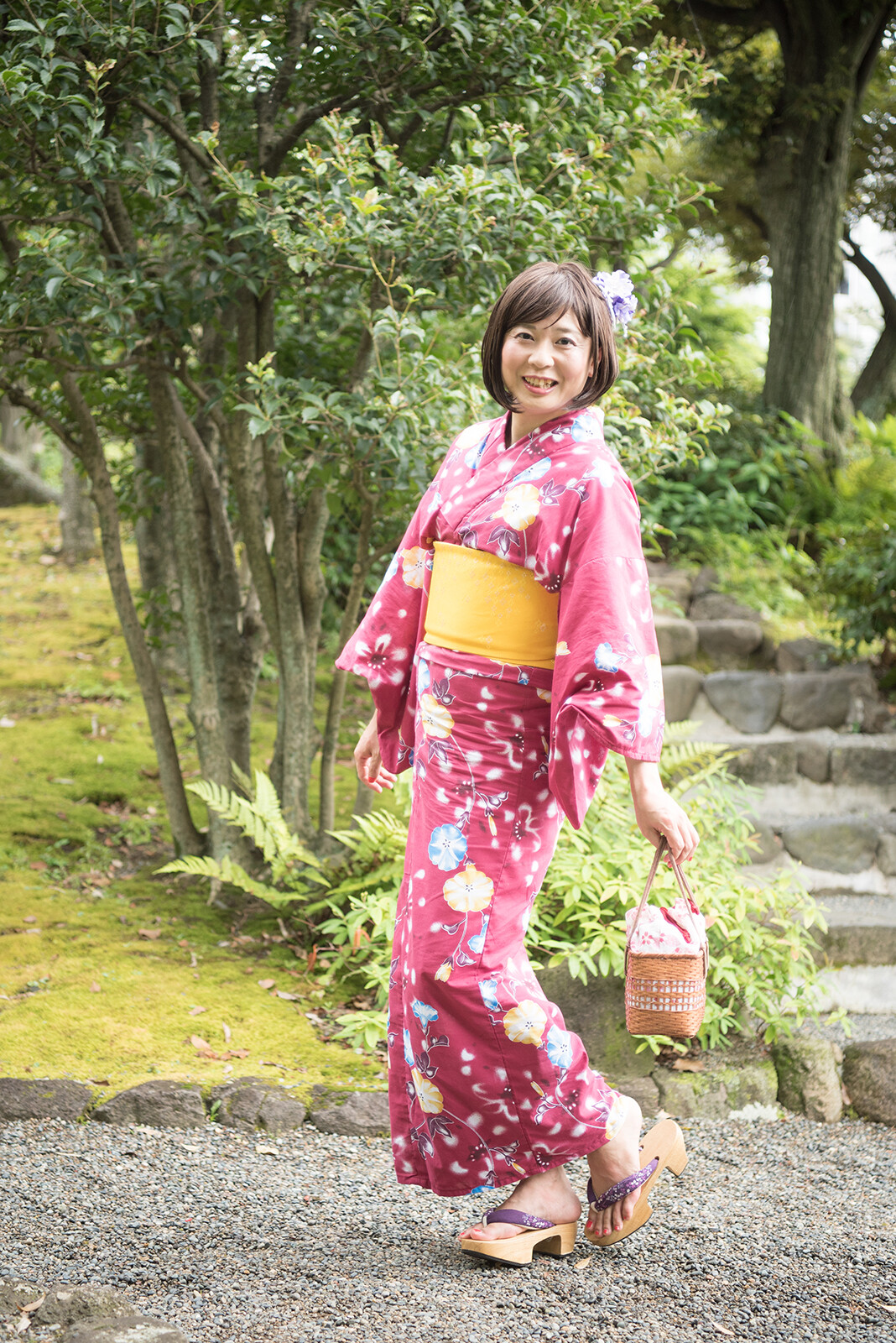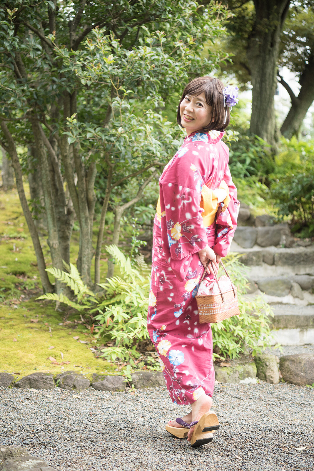 籠バッグと帯結びが見えるのが、このポーズの特徴です